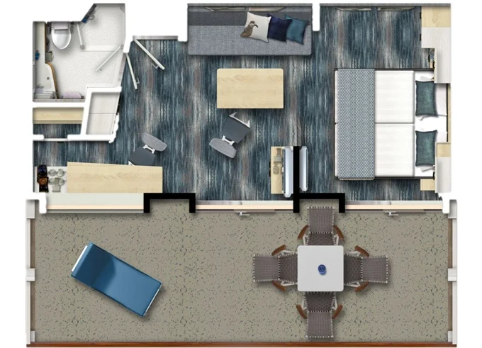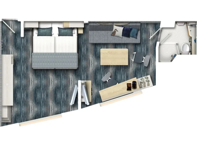 SKHO - Himmel & Meer Suite 42 m² + prekrytá terasa 29 m² na poschodí so stolom, ležadlami a s hojdacou sieťou. 14. paluba. Max 4 osoby. Výhody Suite. 21 436 € 5 359 € za osobu