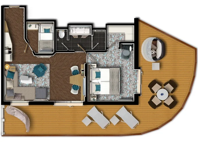 | SUDO - Diamant Suite 42 m² + balkón 47 m² so stolom so 4 stoličkami, s hojdacou sieťou, 2 ležadlami a posteľou Sun island. Spálňa (manželská posteľ), obývacia izba (rozkladacia pohovka), 2. spálňa (lôžko a vyklápacia posteľ), hracia konzola. 6. paluba. Max 6 osoby. Výhody Suite. | 22 248 € 5 562 € za osobu |
